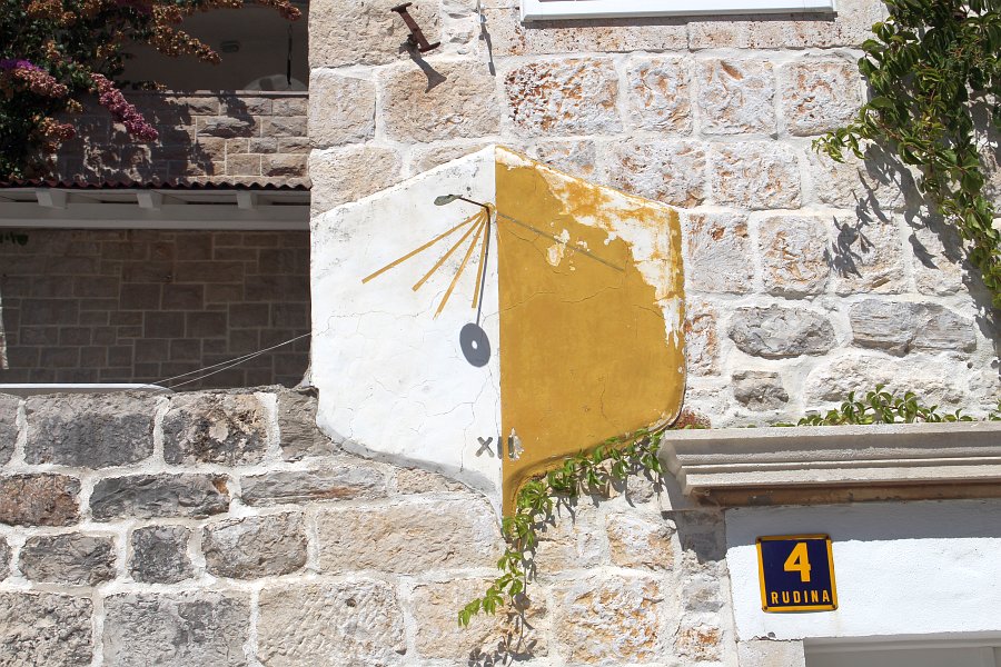 Vertical sundial on the south facade of the family house at address Rudina 4.