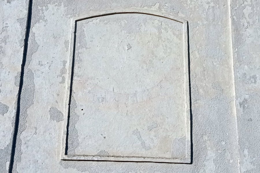 Okomiti sunčani sat na južnoj fasadi kapele. Od originalnog sata ostali su tek obrisi.