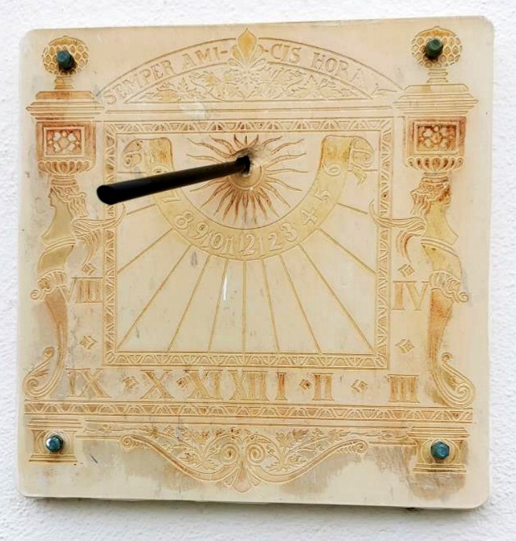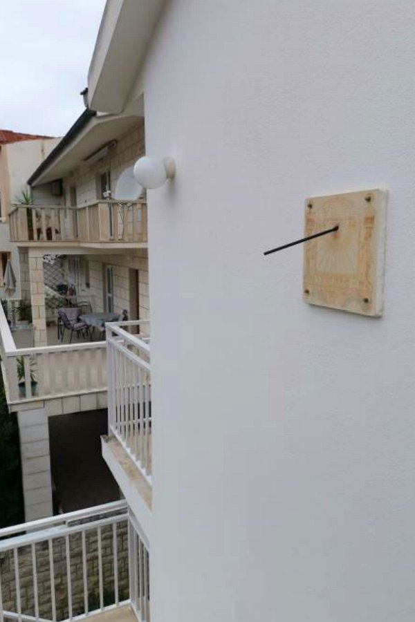Okomiti sunčani sat na južnoj fasadi kuće Novak Šoleti, sa dvorišne strane kuće uz stepenice za prvi kat. Radi se o keramičkom ukrasnom satu.