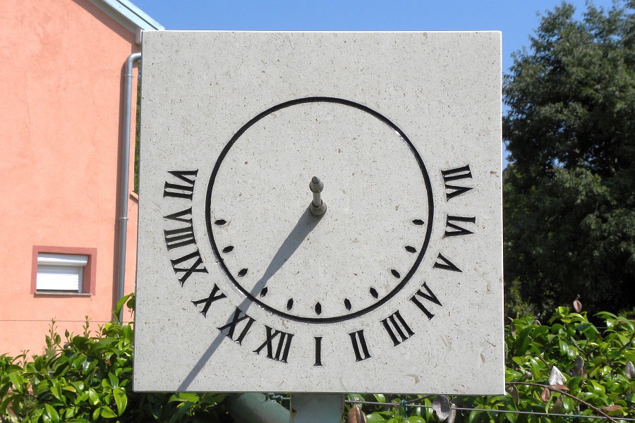 Okomiti sunčani sat na ogradi. Sat je izradio Vladimir Egić kao repliku sunčanog sata u Krku. Dojavio B. Horvatić.